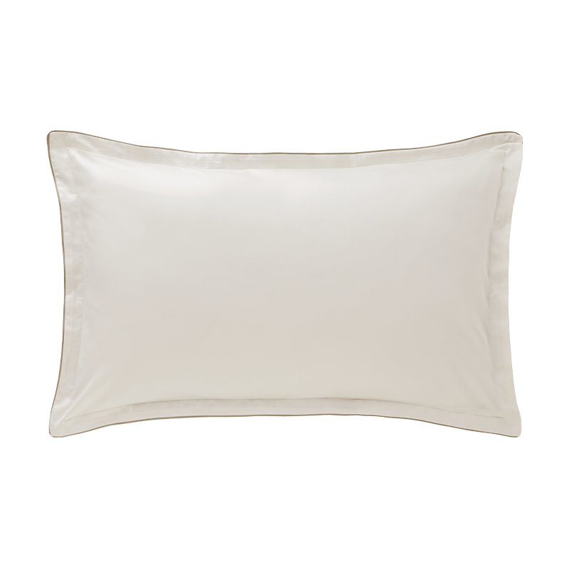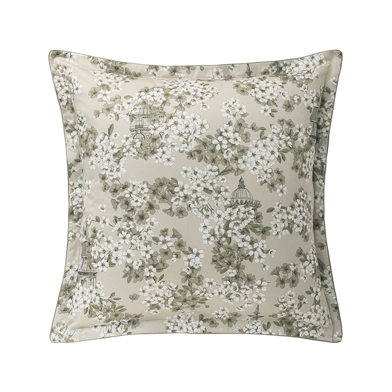 The Fine Fleur duvet cover reveals an exclusive pattern combining a mist of petals with architectural elements of the capital, designed in an engraved effect. The soft palette of off-white, khaki, beige and touches of pink rests on a warm "gazelle" background. The plain "ermine" reverse offers a luminous breath, for a set balanced between plant poetry and urban elegance. A khaki piping delicately frames the whole.