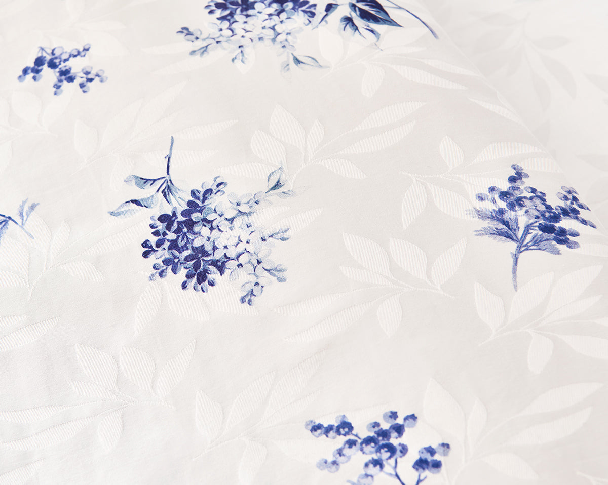 Cristal flat sheets have the white leaves jacquard woven design with the blue flowers print.