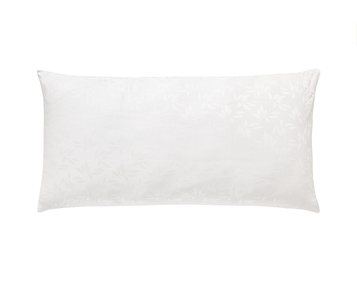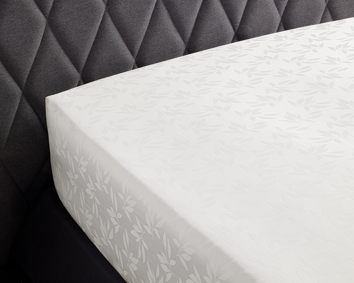 Cristal fitted sheets and pillowcases are made with the white-on-white jacquard woven leaves design.