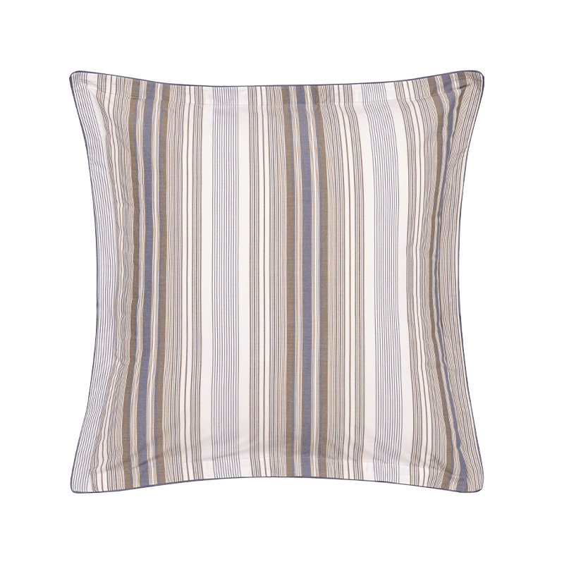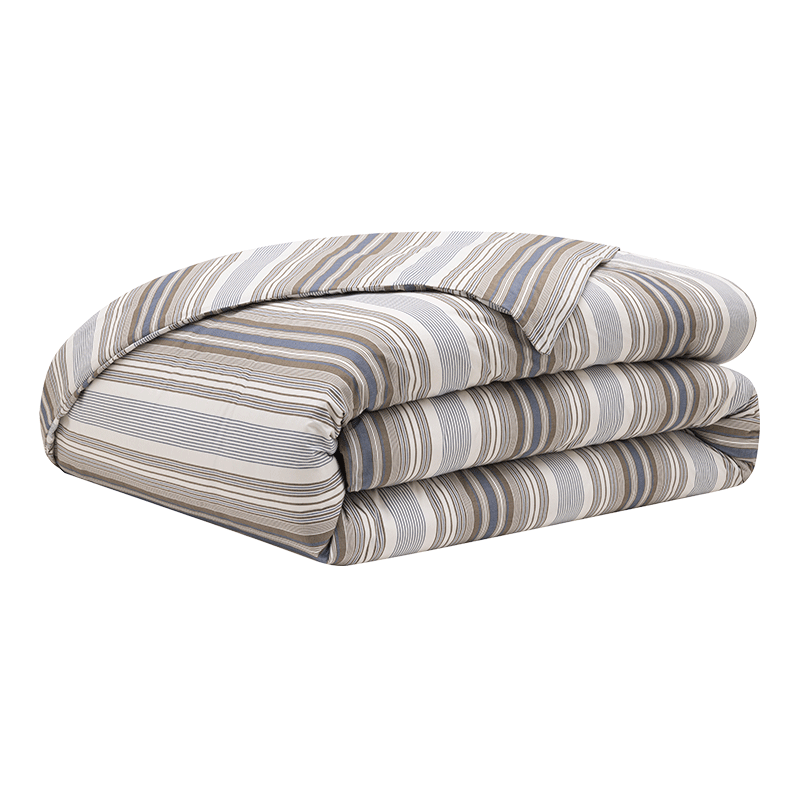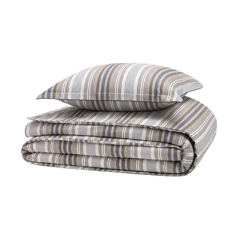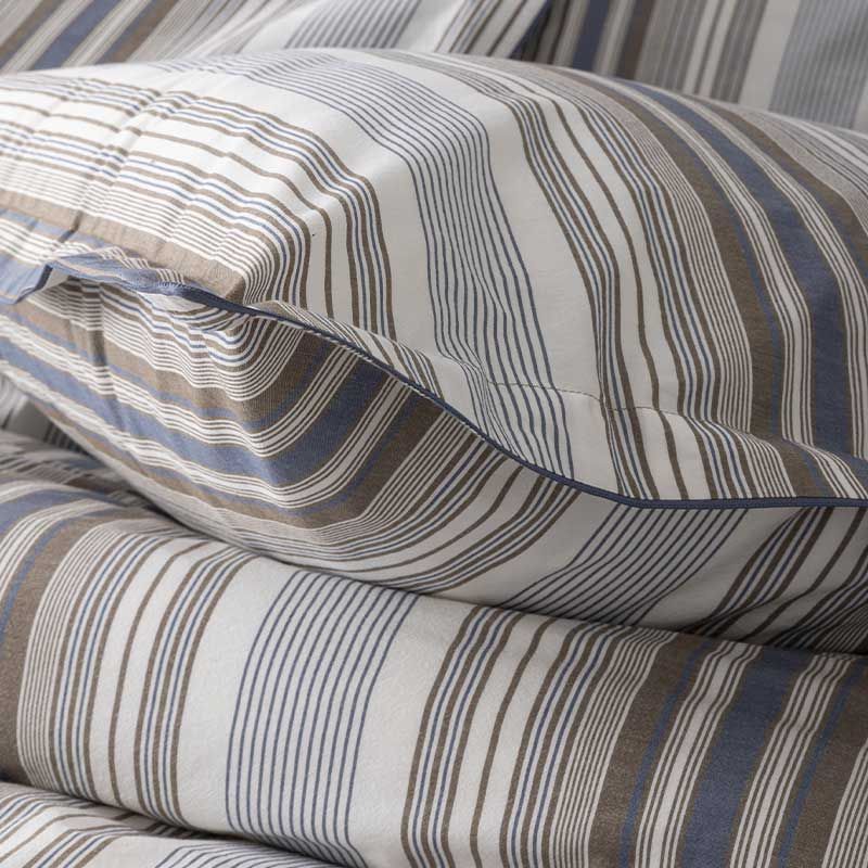 In GOTS-certified organic cotton poplin, this light and soft set evokes men's summer shirts with its fine woven-dyed stripes in mottled brown and blue tones. Water-tumbled for a washed effect and a more natural feel, it combines vintage style and modern comfort.