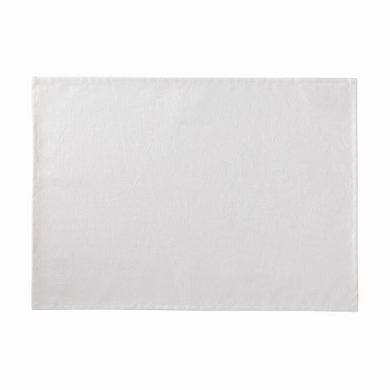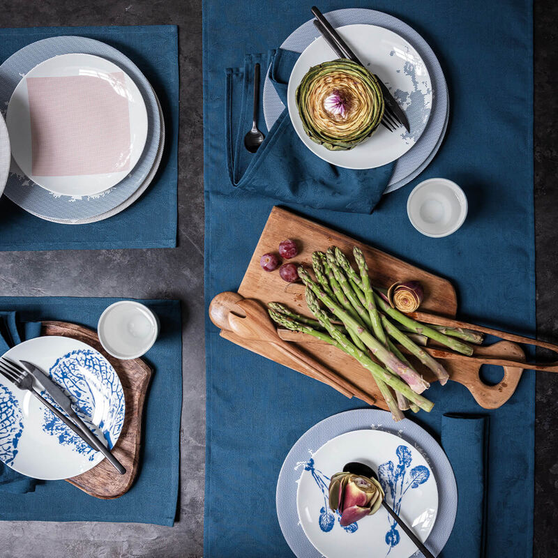 Escape for a botanical getaway into the heart of a flourishing arboretum. Bushes, foliage, and delicate acacia leaves with intricate veins grace this light-textured canvas. These fluid and authentic patterns blend with deep hues for an elegant, modern, and relaxed table setting.