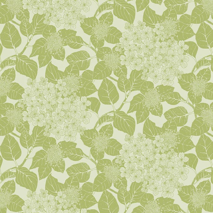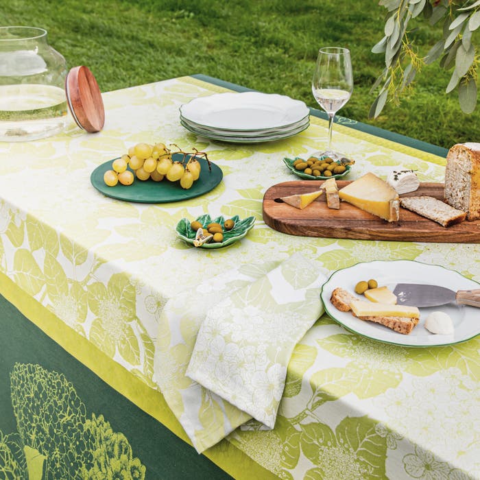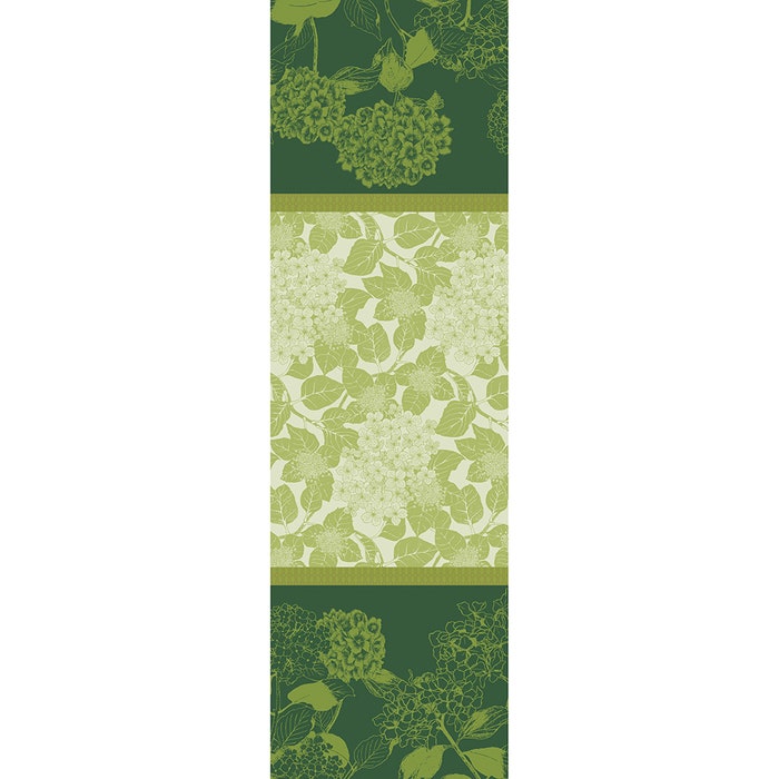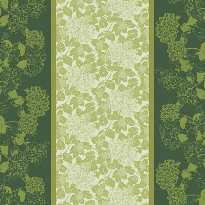 French tablecloth adorned with basil and olive greens. Hydrangeas are thoughtfully treaded from beginning to end to simulate flower beads, as they tend to grow vastly when watered consistently. It is a truly unique plant known to be symbolic of boastfulness, and it even has its own day dedicated to it every January 5th. This linen is designed to blend into every season of the year, from Spring to Winter.