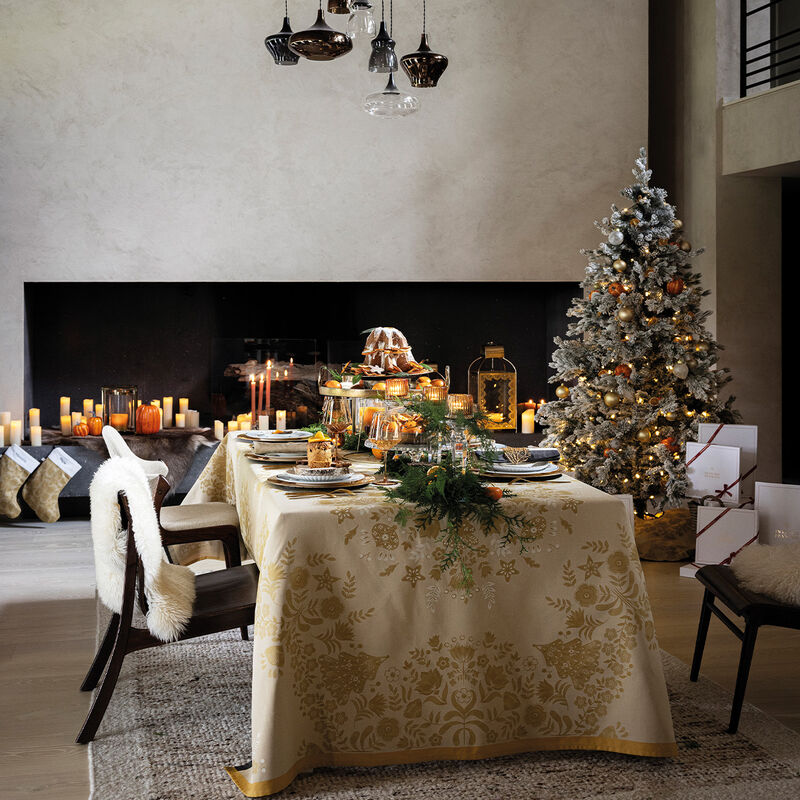 Let yourself be enchanted by the magic of a folkloric Christmas from afar, where joy and light intertwine. Inspired by traditional woodwork, painted flowers are reimagined as refined wreaths and garlands. Christmas trees, stars, and decorative baubles add a sparkling touch to enhance every festive moment.