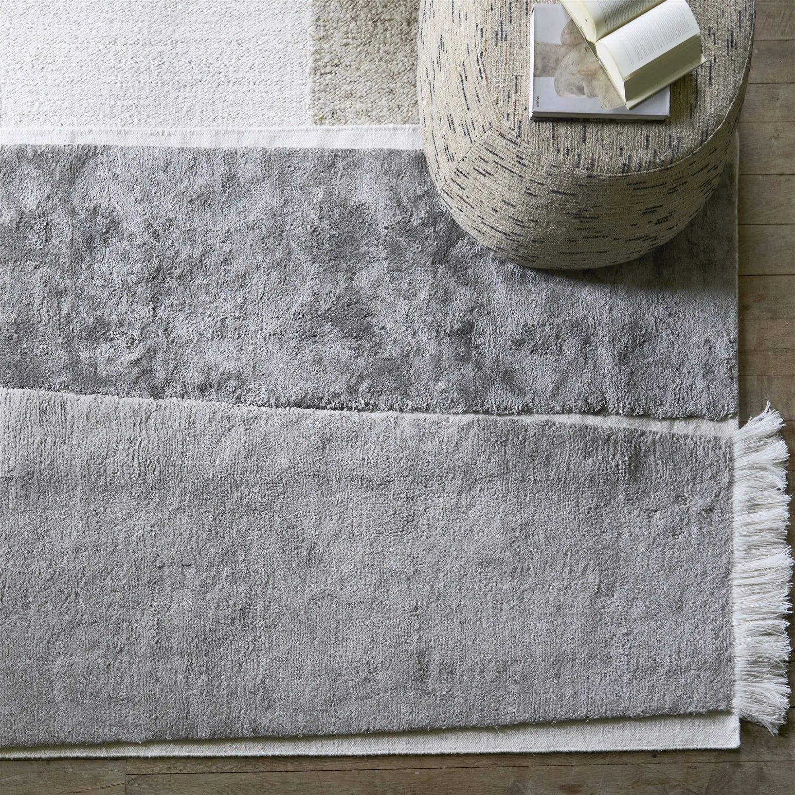 This statement and luxurious geometric rug, combines graphic high pile sections of grey wool and Tencel® viscose in contrast with the flat woven off-white pure wool ground. This elegant floor rug features sections of hand finished fringing at the edges to enhance the graphic forms. This rug has no additional backing but we do advise that all our rugs should be used in conjunction with an anti-slip underlay, particularly on smooth surfaces.