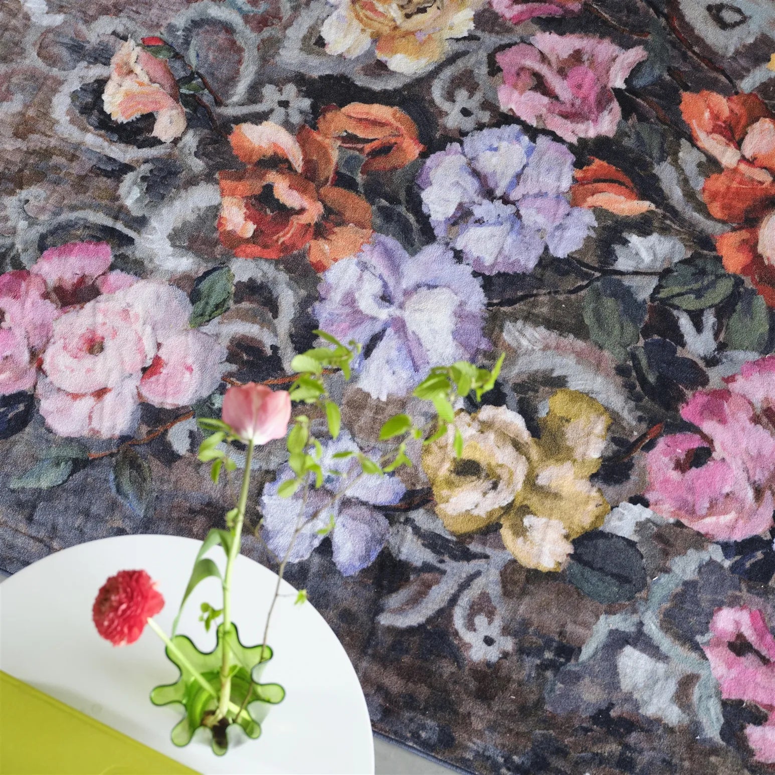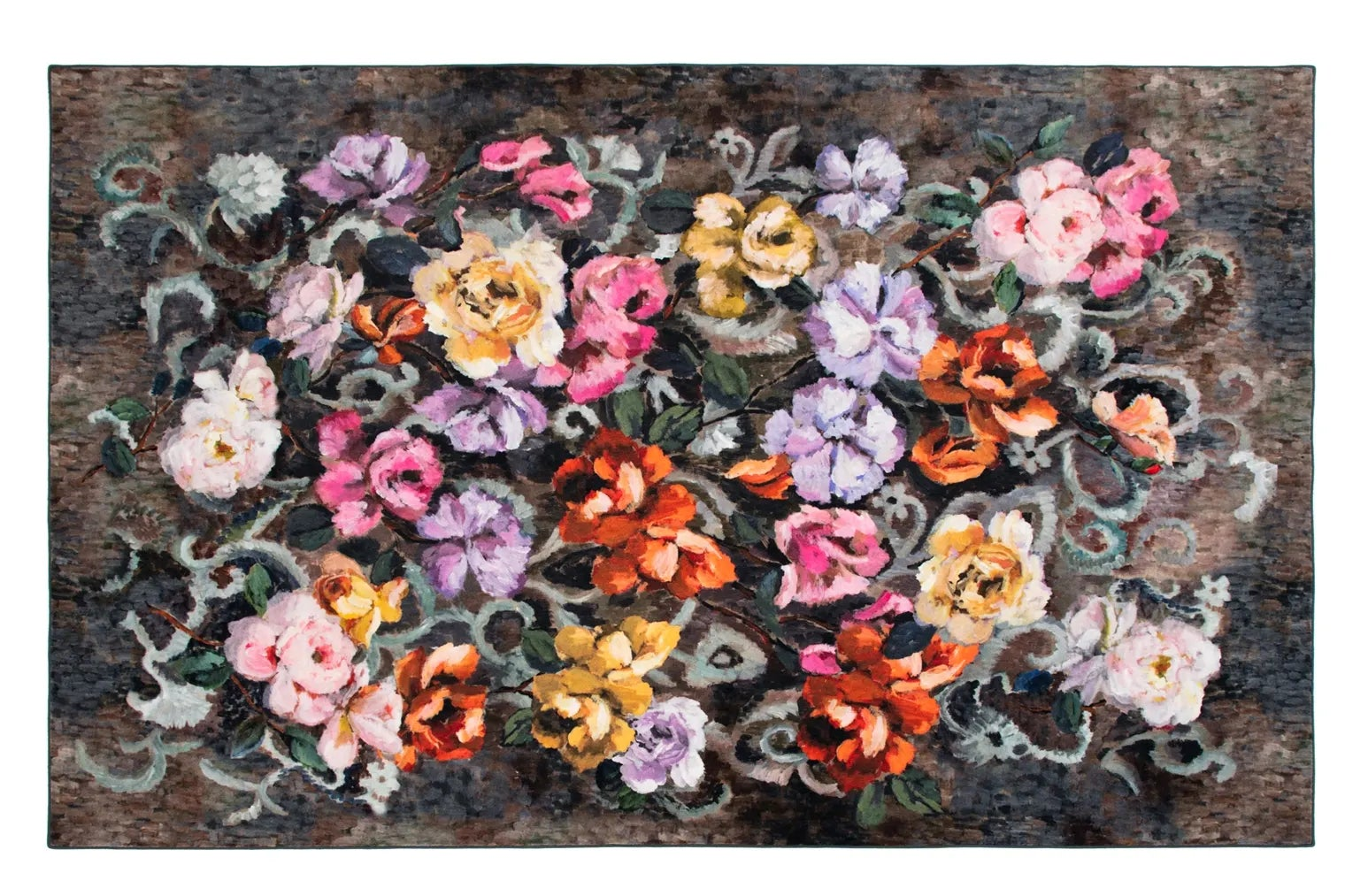 This stylish rug features expressive, painterly flowers combined with a tapestry inspired scrolling pattern and a textured background. In rich evocative shades, this sophisticated decorative floral rug is digitally printed onto a hard-wearing short pile polyamide ground