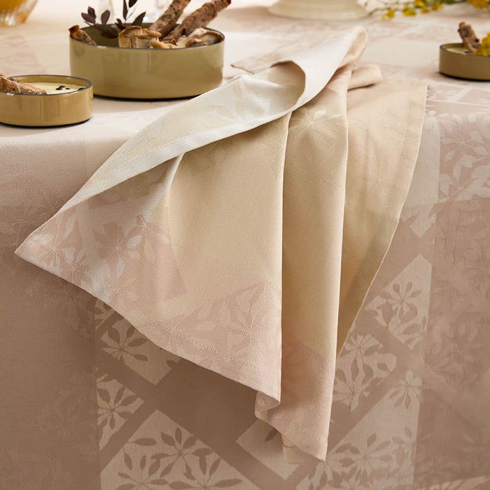 The Mille Pistils Naturel Tablecloth is woven in France from 100% extra-long staple cotton, offering a smooth jacquard weave with a subtle, elegant texture. Its contemporary pattern in layered neutral tones is skillfully created through the careful blending of threads, highlighting the artistry of French textile design. Sophisticated and versatile, it brings understated beauty to modern dining spaces.