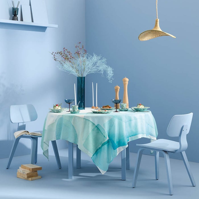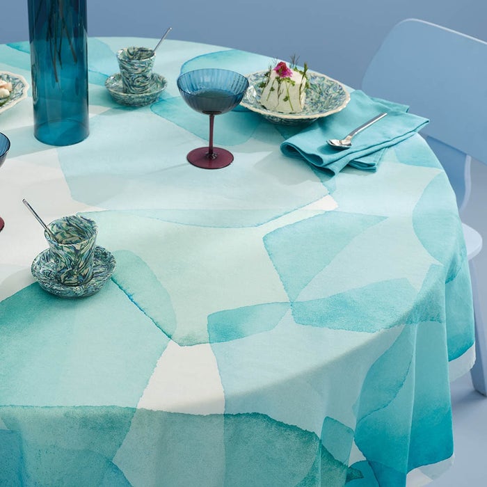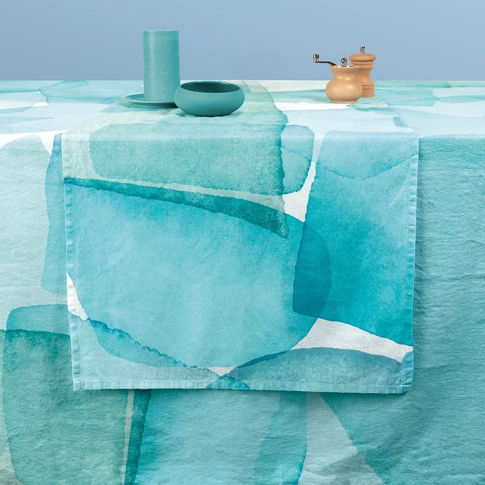 Designed in France by our team of artisans, the Aqua Mineral Tablecloth showcases layered watercolor tones in blue and green printed on a flowing cotton-linen blend. This allows the artwork to unfold with quiet elegance, creating a refreshing, contemporary dining atmosphere.