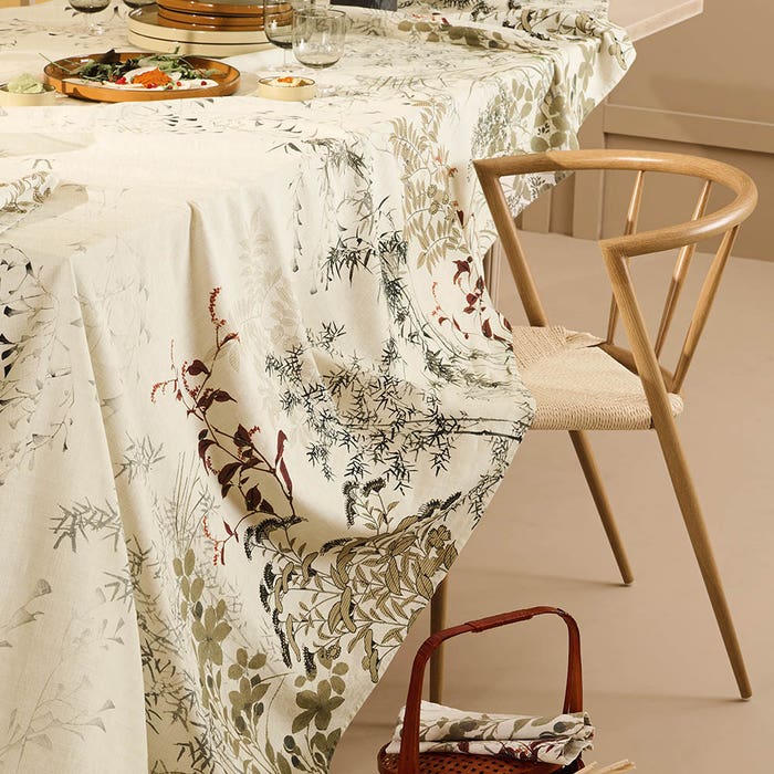 The Bambous Parchemin Tablecloth is woven from a refined cotton-linen blend, prized for its elegant drape and long-lasting quality. Designed by our team of French artisans, the printed parchment-white pattern features an all-over motif of bamboo and leaves in warm brown and red tones. Naturally sophisticated, this tablecloth brings an organic, tranquil beauty to any dining space.