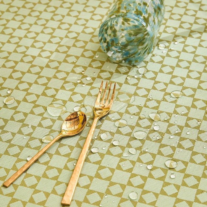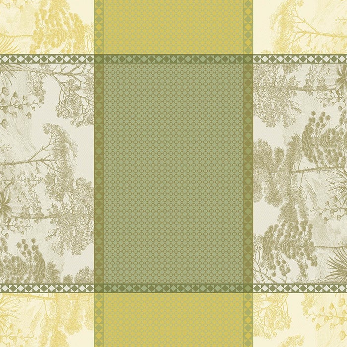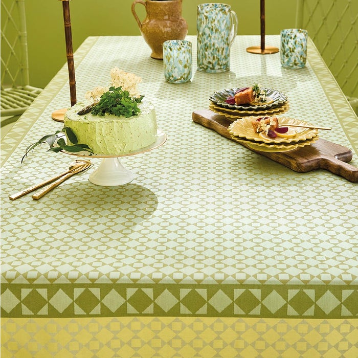 The Le Sud Vert Jacquard Tablecloth highlights its botanical design through richly layered green tones woven into tree motifs and bordered by crisp cross lines. Finished with Green Sweet stain-resistant technology, the cotton jacquard maintains its softness while offering practical protection.