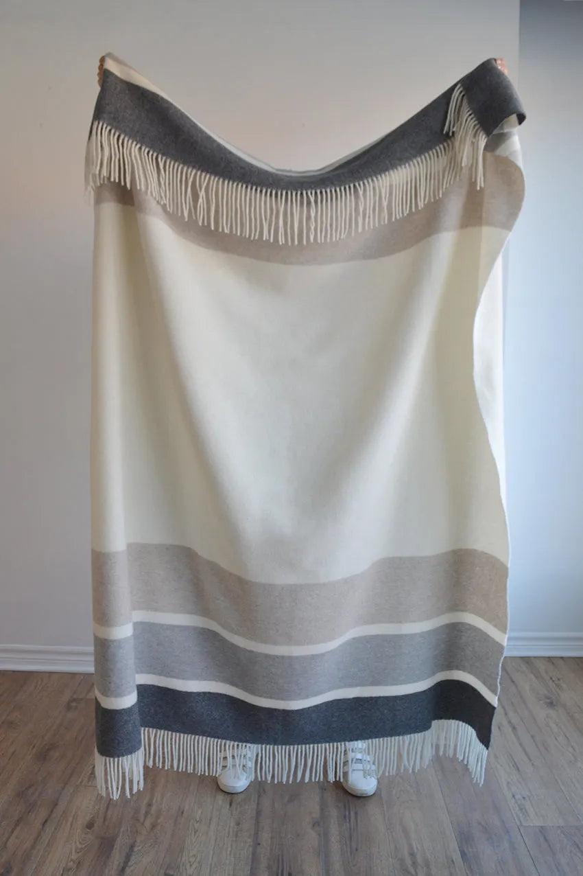 Three bold stripes on each end of this soft wrap-able throw makes it stand out. Suitable for any room in your home.
