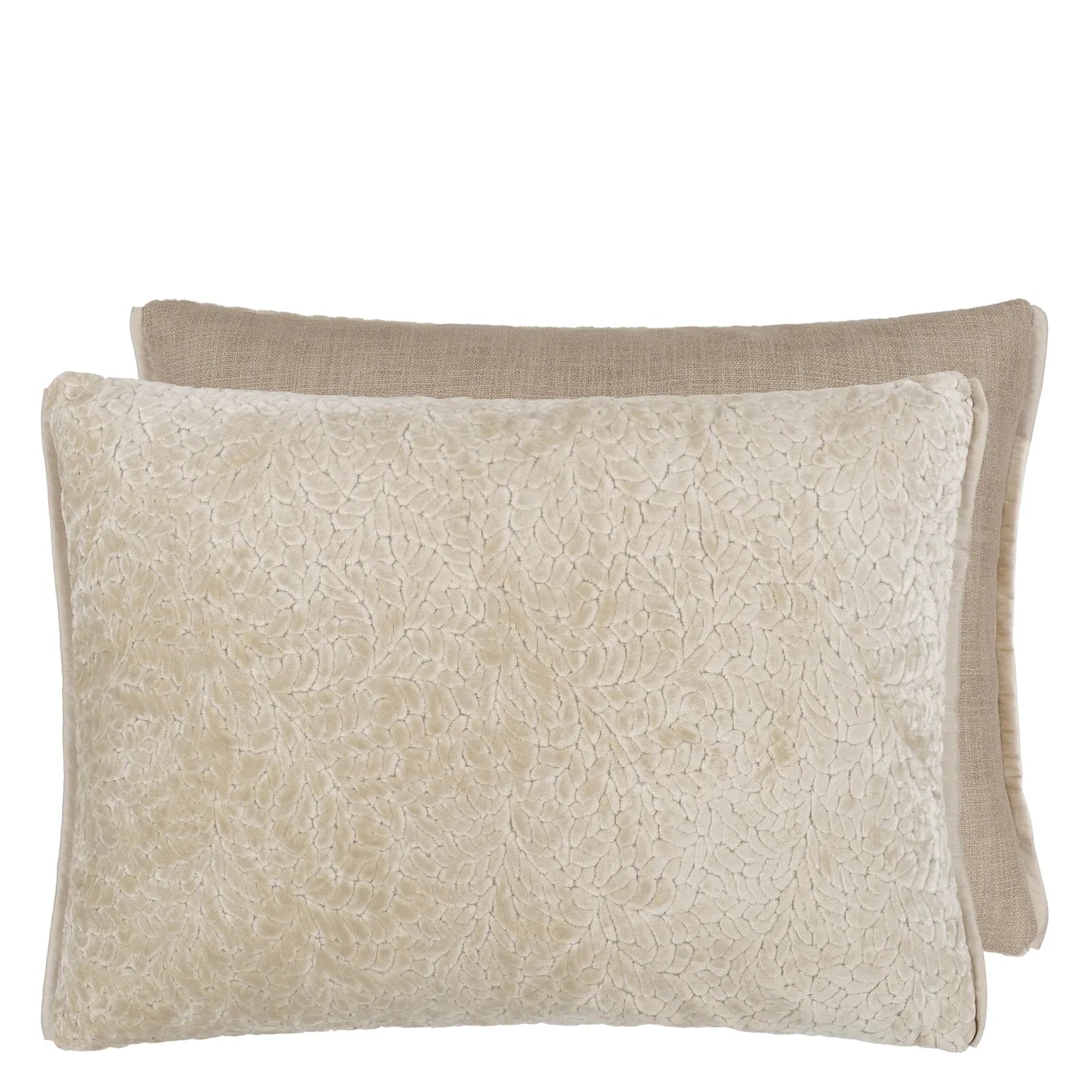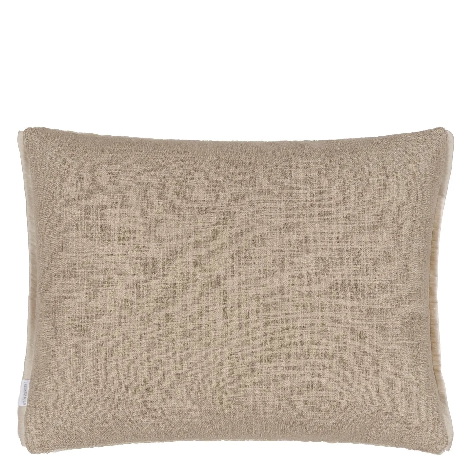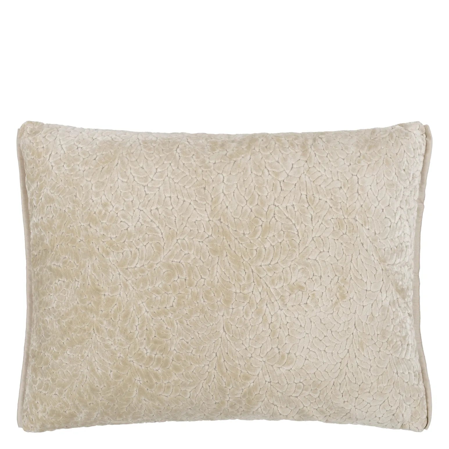 Add a touch of luxury and glamour to your interior setting with this stylish large rectangular velvet decorative pillow in linen. Featuring Cartouche with small scale leaves jacquard woven in a swirling multi directional pattern, reversing to Carylon in driftwood and finished with an elegant trim on two sides with Chaviere in parchment.