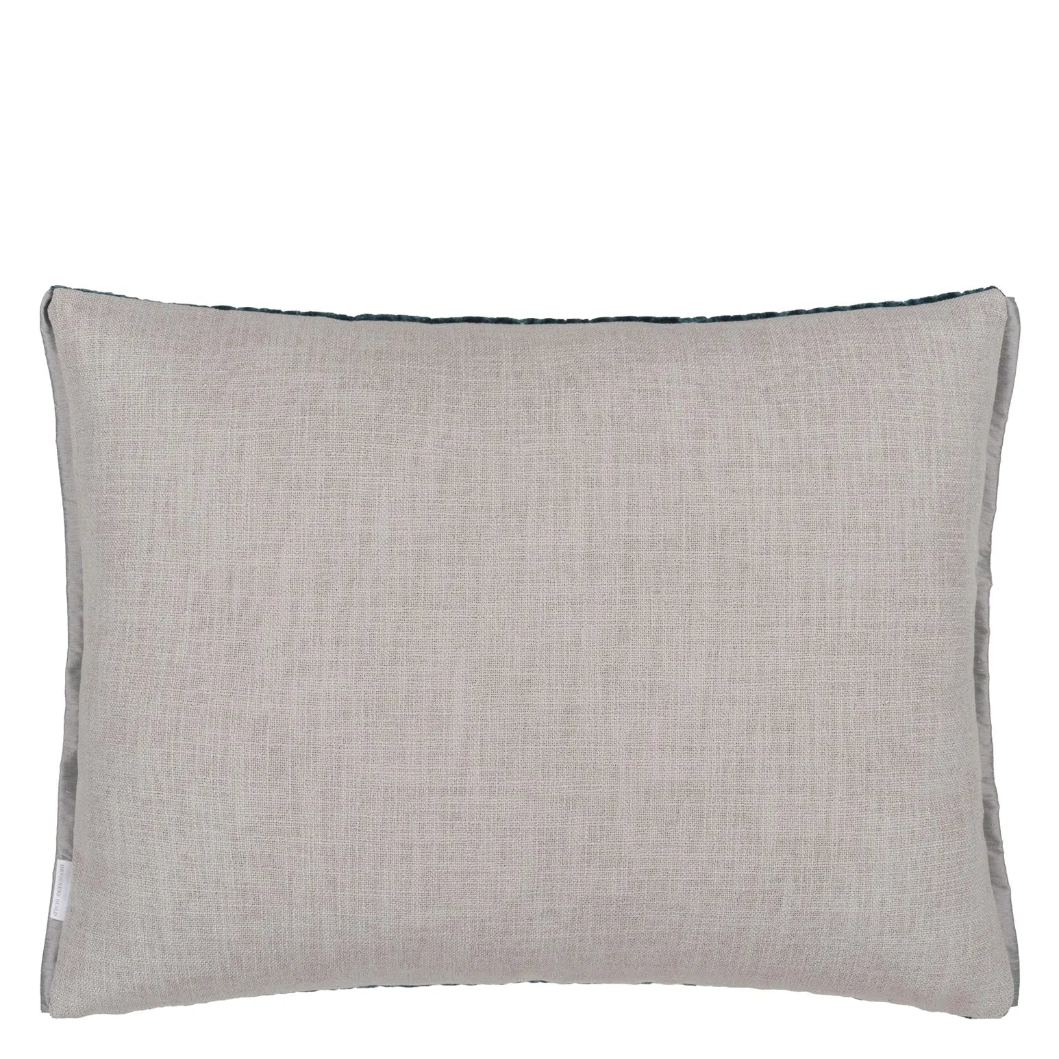 Add a touch of luxury and glamour to your interior setting with this stylish large rectangular velvet decorative pillow in teal blue. Featuring Cartouche with small scale leaves jacquard woven in a swirling multi directional pattern, reversing to Carylon in zinc and finished with an elegant trim on two sides with Chaviere in silver.