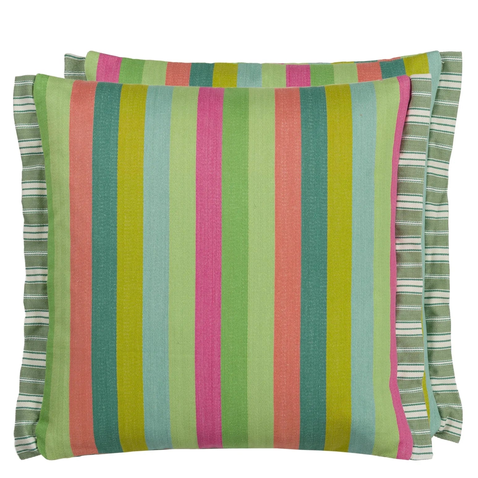 A charming multi coloured cotton woven stripe decorative pillow in vibrant shades of fuchsia and emerald green is paired with a smart mid scale tonal stripe and finished with a contemporary pin striped trim on two sides. The perfect striped decorative pillow for your interior scheme.
