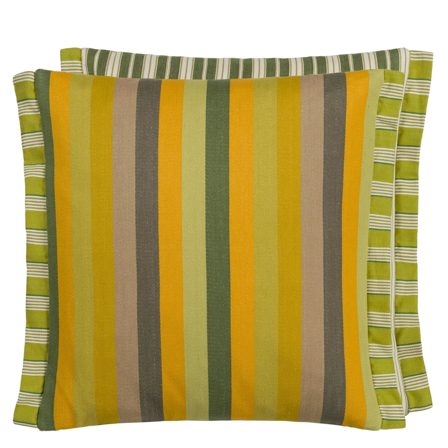 A charming multi coloured cotton woven stripe decorative pillow in gorgeous shades of mimosa and natural is paired with a smart mid scale tonal stripe and finished with a contemporary pin striped trim on two sides. The perfect striped decorative pillow for your interior scheme.