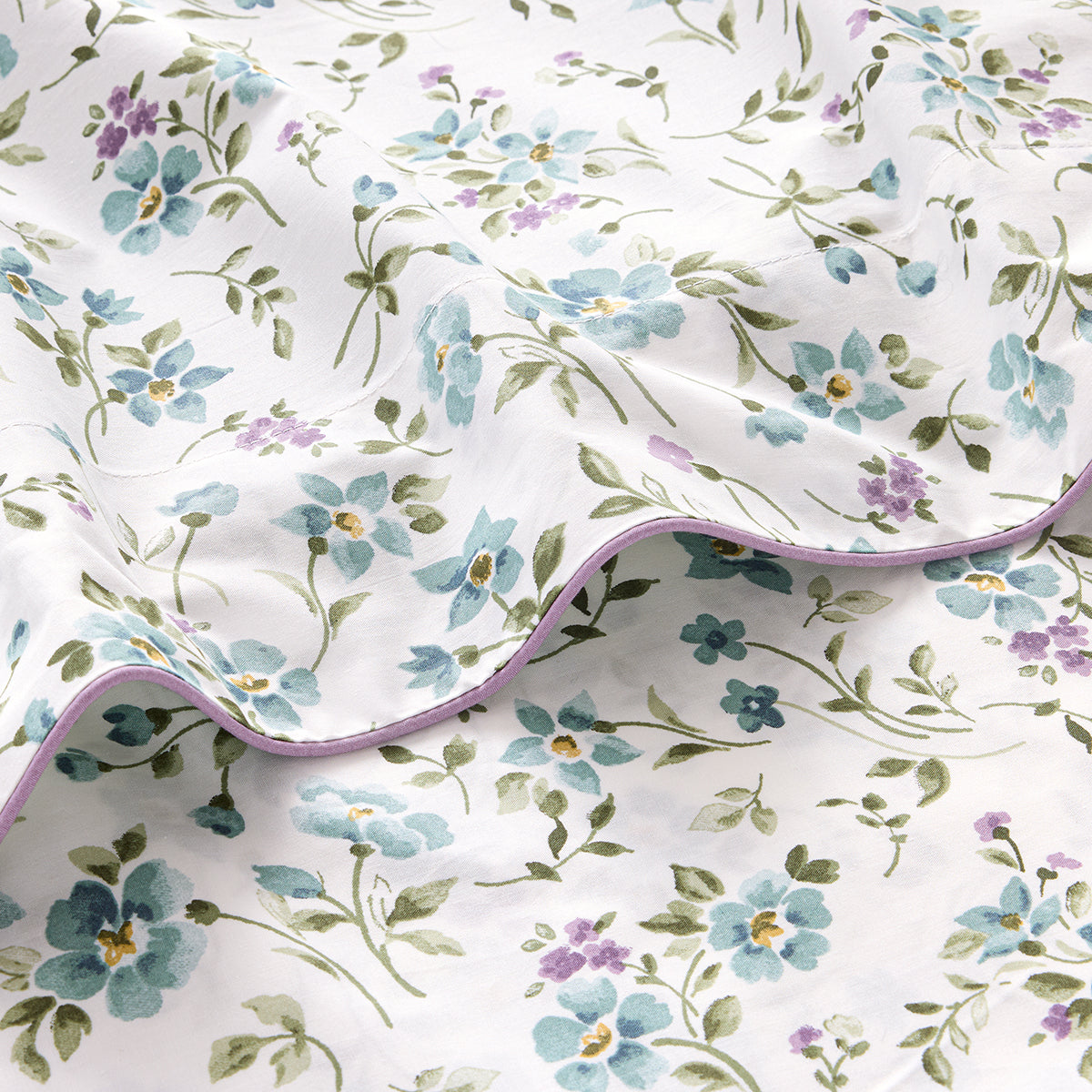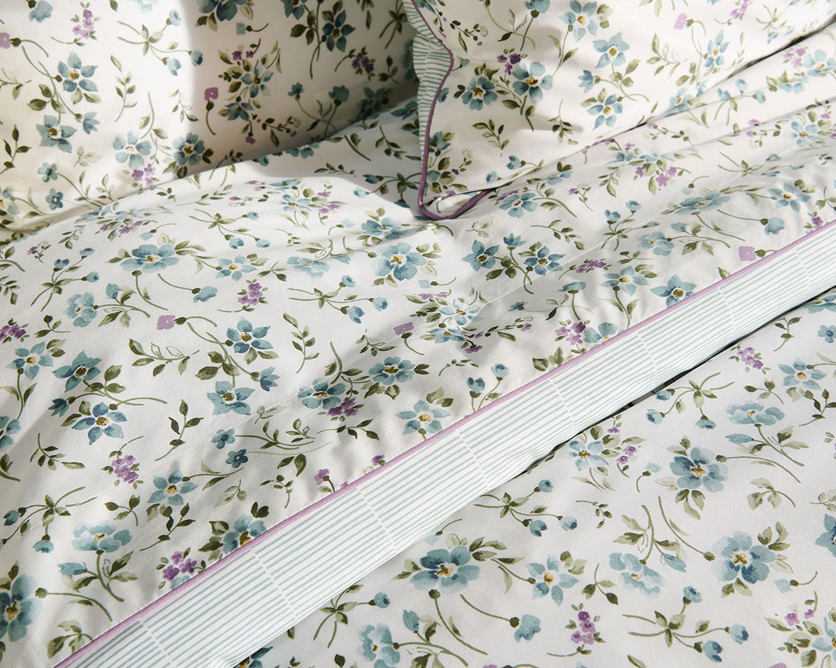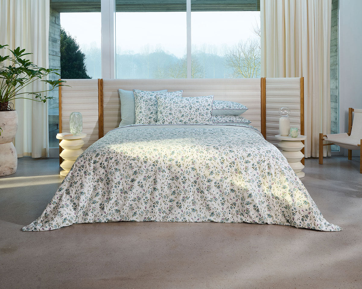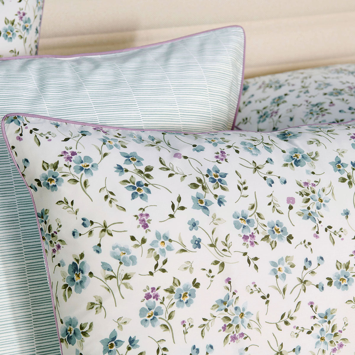 Fugace duvet covers and shams have the all-over periwinkle flowers print on one side and the small horizontal stripes print on the other side.