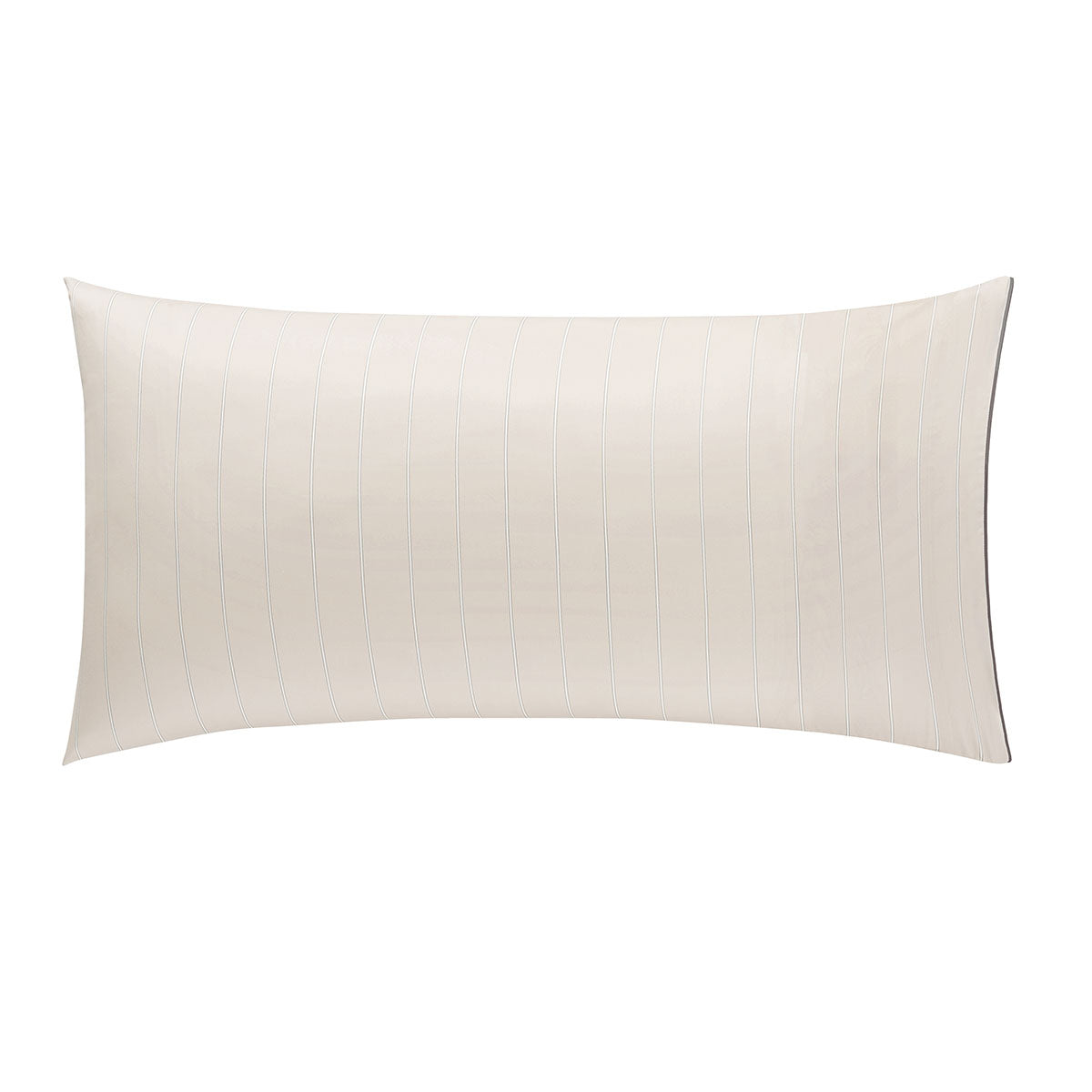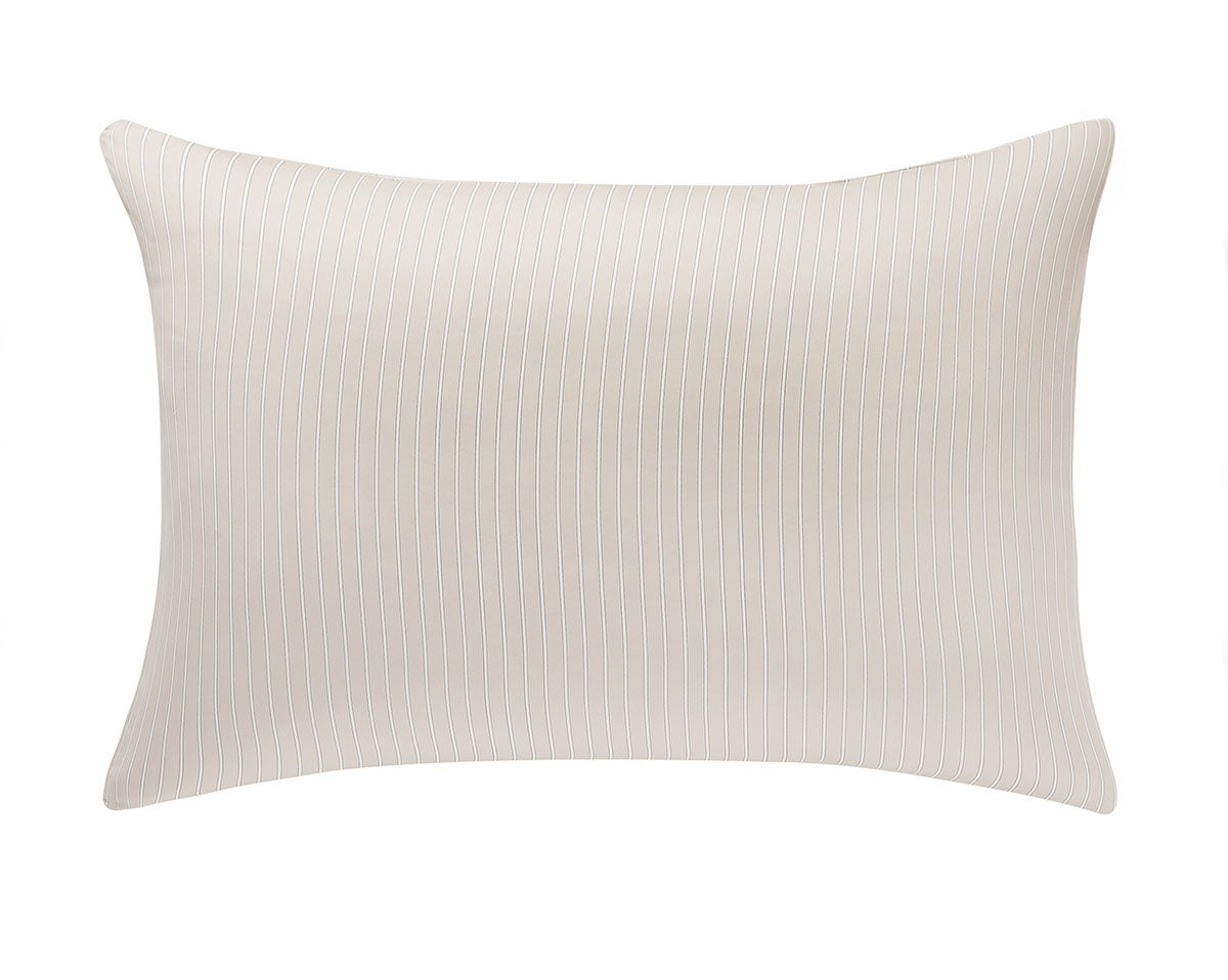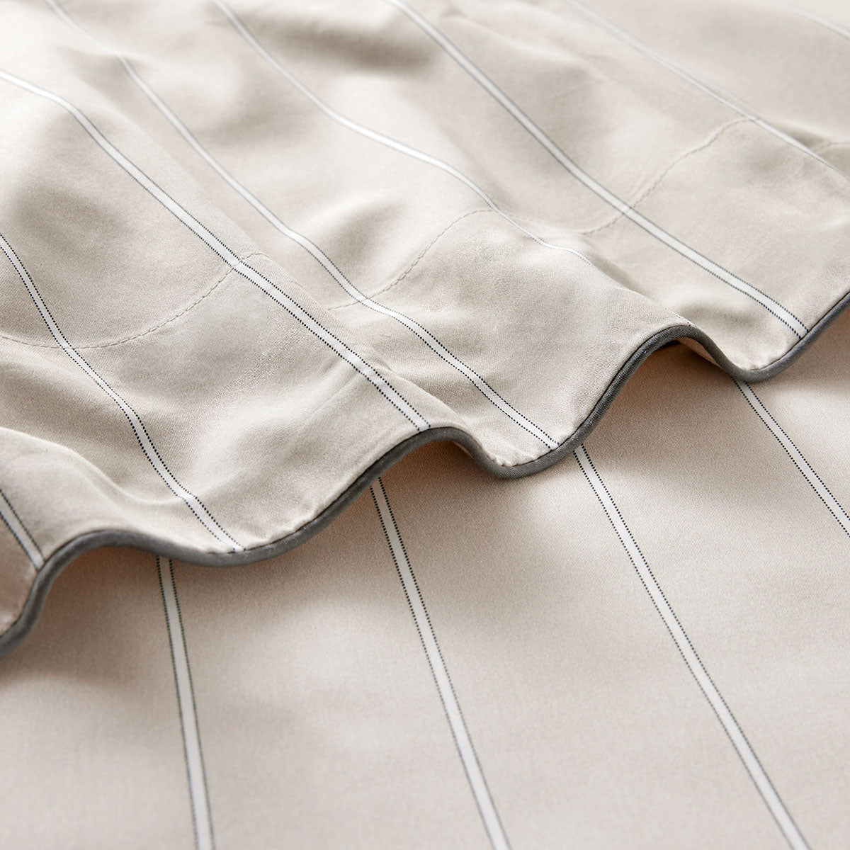 Journey bedding offers a very soothing, relaxing combination of charcoal outlined white stripes on a light beige ground.