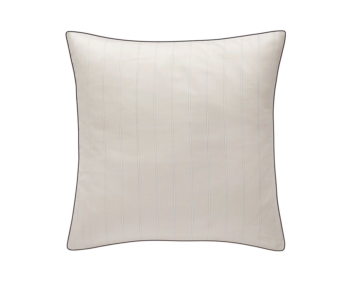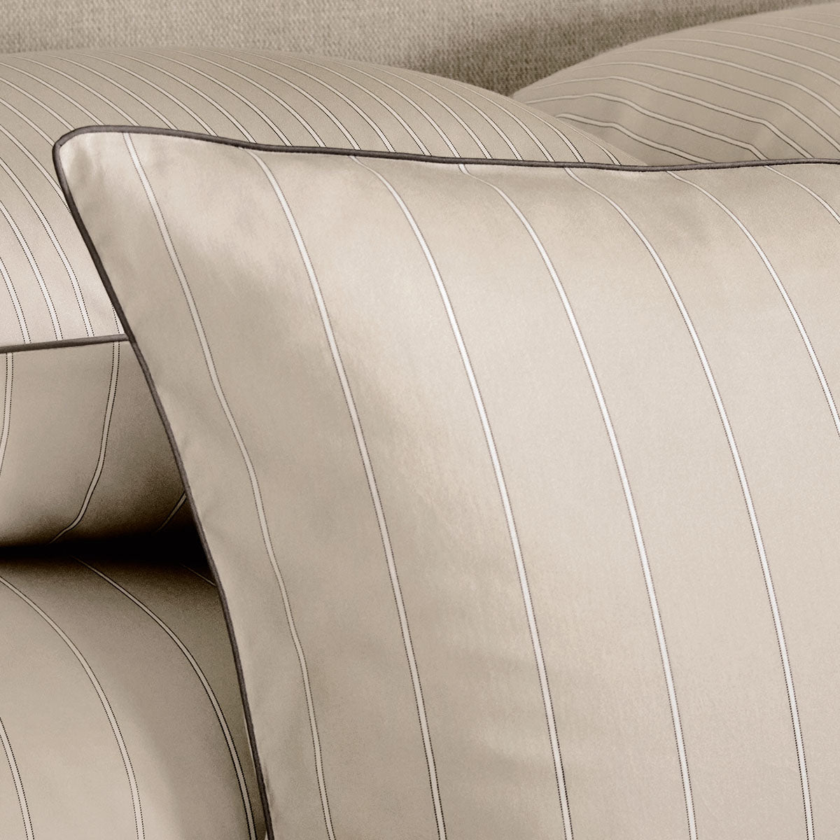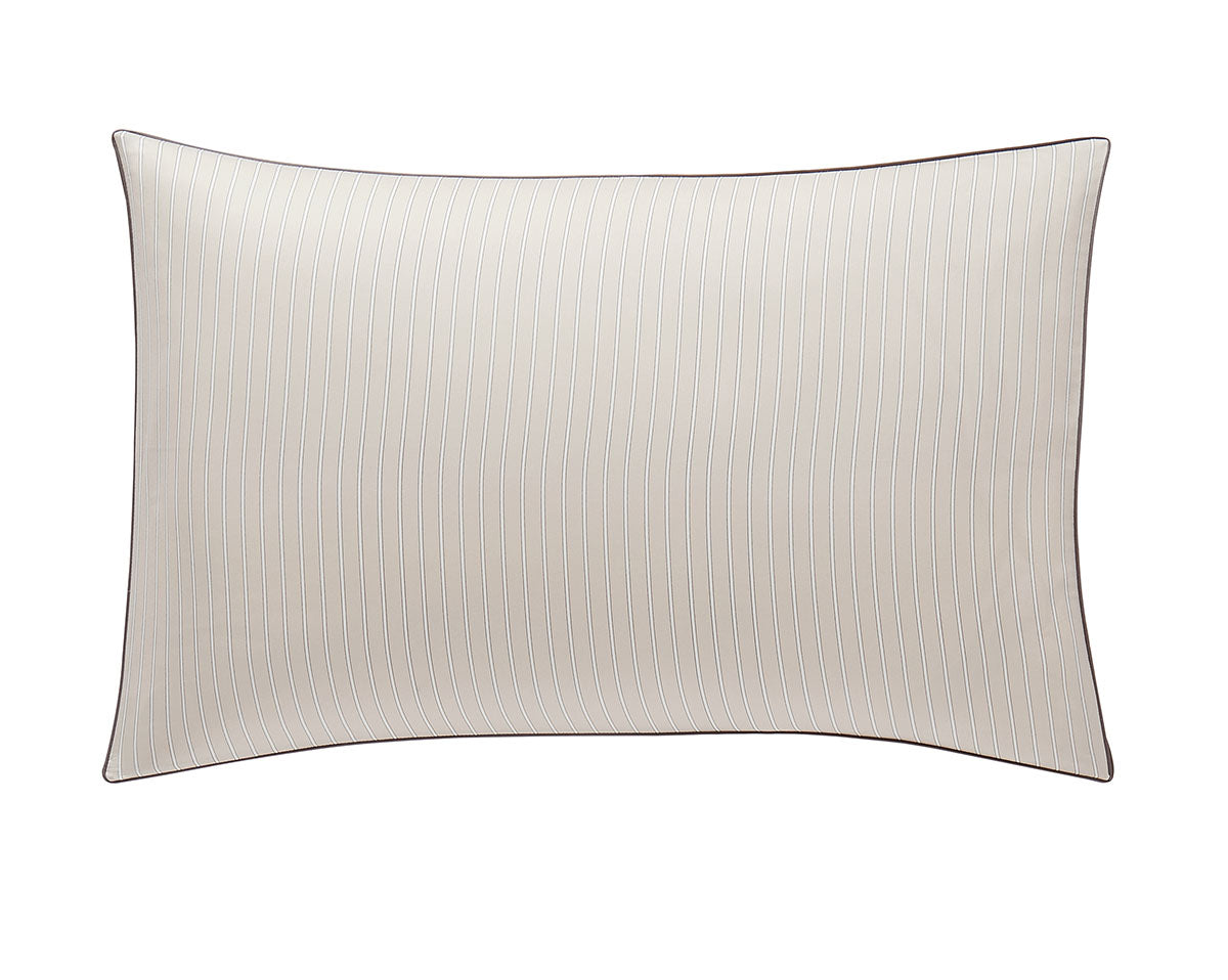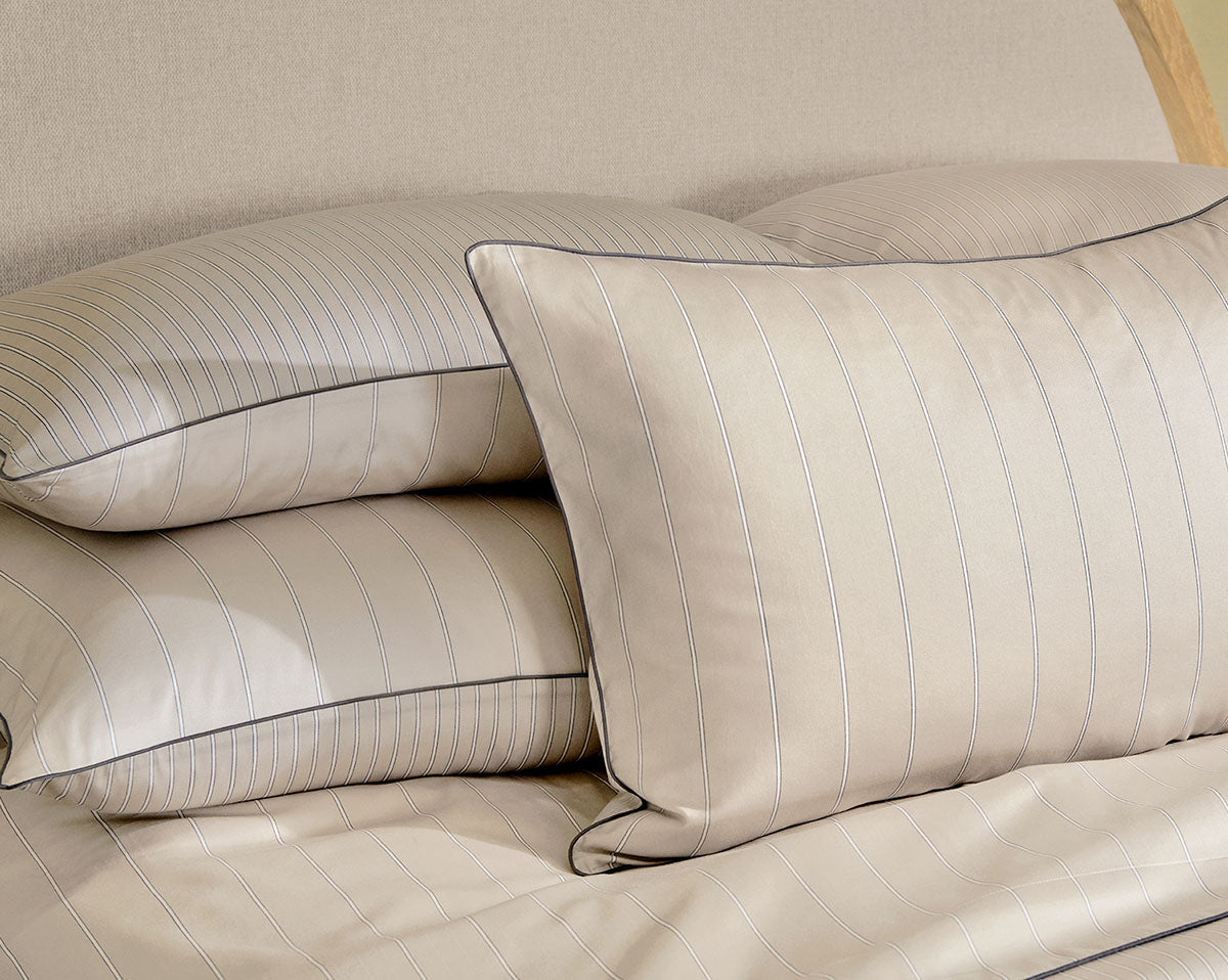 Pillowcases, flat sheets and shams are embellished with a charcoal-coloured hand guided piping detail.