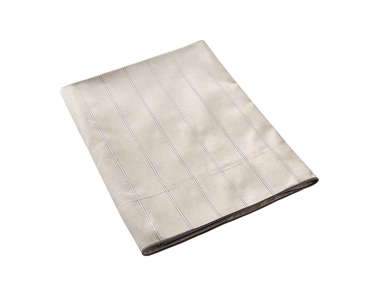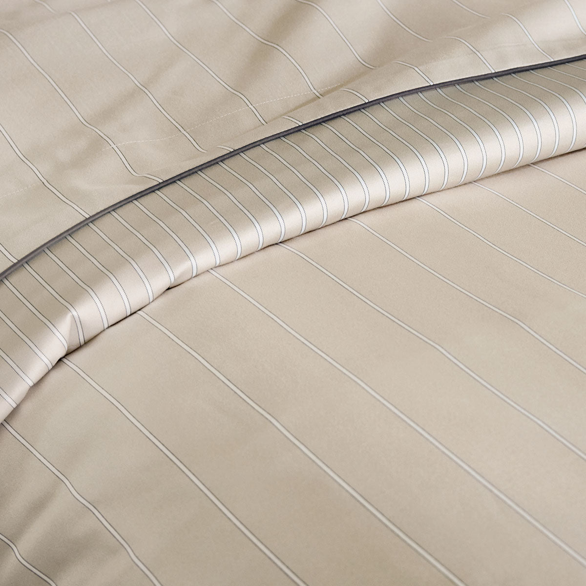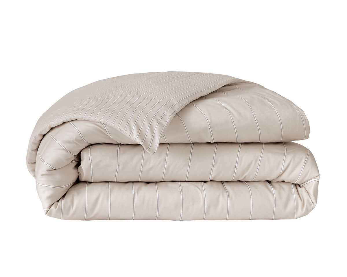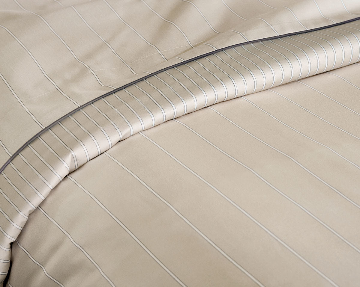 Journey duvet covers and shams are reversible, with the front having fine vertical stripes and the reverse side having wider spaced stripes.
