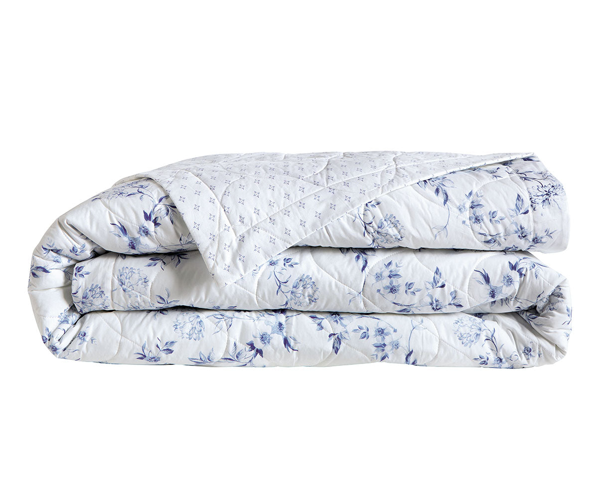 Malacca printed coverlets follow the layout of the duvet covers and shams, but the flowers print is framed with the earthenware faïence tiles print and the coverlets have a spherical quilted stitch embellishment