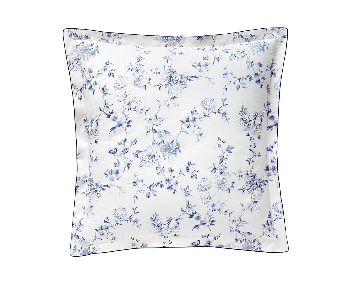 Malacca duvet covers and shams have a blue-on-white design of Eglantine and Dahlia flowers, done in a painterly way, on one side and a stylized French earthenware faïence design on the other side.
