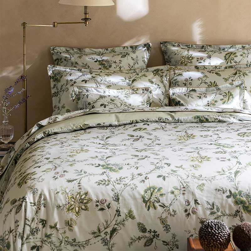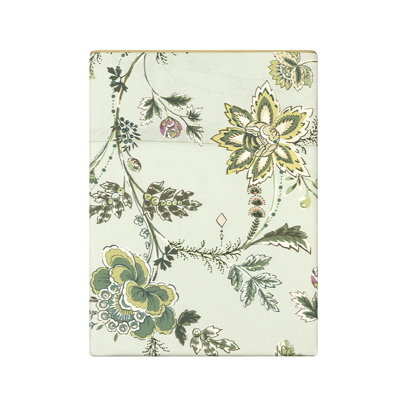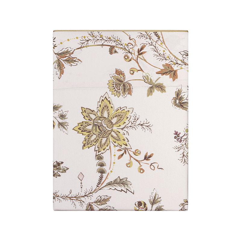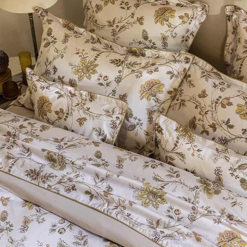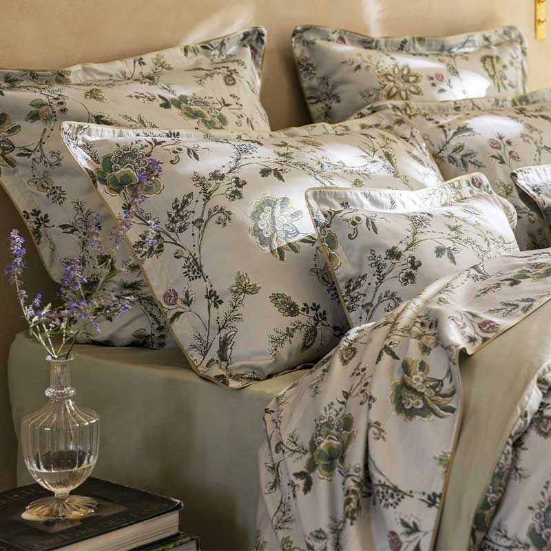 The Maussane bedding set is a contemporary reinterpretation of the famous Provençal Indiennes, printed fabrics that arrived from India in the 17th century and were quickly adopted by the region. Inspired by the authentic charm of the village of Maussane, located in the Alpilles, this design retains the original spirit of stylized floral patterns while adapting them to modern colors and trends. The set stands out with its refined motifs of large flowers and foliage, connected by vines forming sumptuous arabesques, rich in subtle details. The delicate finish of organic cotton satin, combined with a light solid-colored background, highlights the richness of the patterns, creating a perfect balance between tradition and modernity.