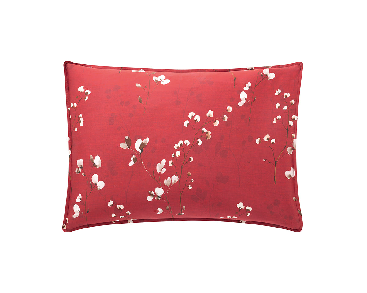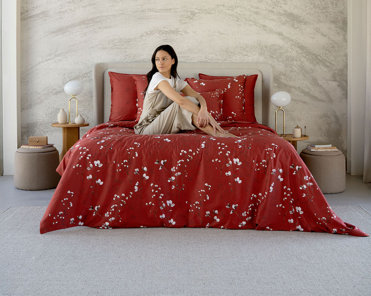 Minimaliste flat sheets are made with the cherry blossoms print in beige on the earthy red ground.