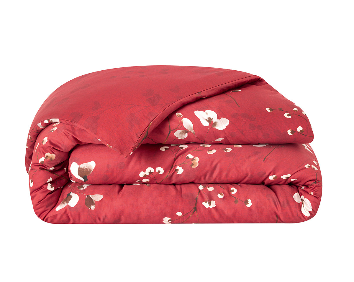Minimaliste duvet covers and shams have the cherry blossoms in beige on the earthy red ground on one side and the flowers done in an earthy red, on the ground on the other side.