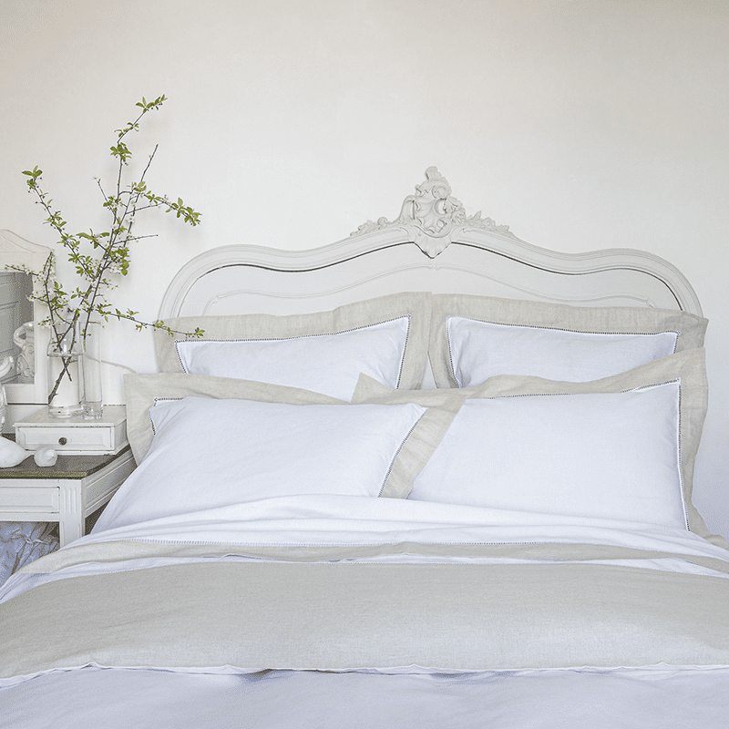 The Paris bed linen set is a timeless Alexandre Turpault bed linen: two-tone white and natural, its fabric is a 48% linen / 52% cotton that combines the properties of both fibers. Its Venice day finish perpetuates the tradition of elegant finishes, proposed in the Alexandre Turpault collections since 1847.