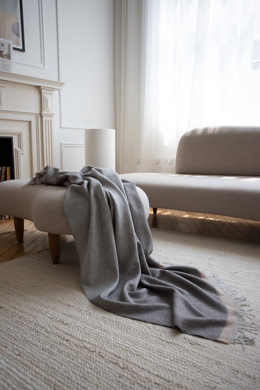 Mother Nature's softest throws are made from Baby Alpaca. Versatile and luxurious with lightweight warmth, the fringes on either end adds a chic, artisanal look. The steel tone fades in the middle with an ombre effect. The contrasting border stripe adds another layer to the design.